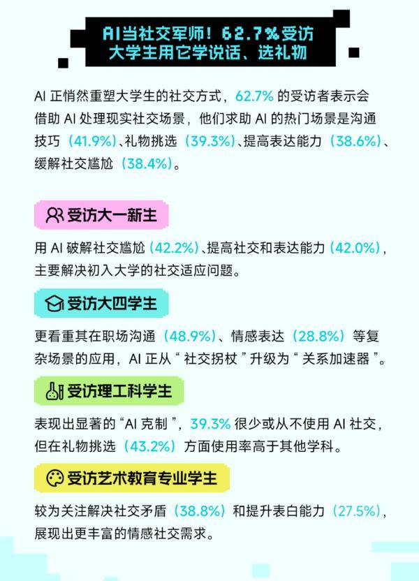 却一直珍爱实情面感的温度。当手艺迭代不竭加快,48.3%的受访者通过AI查询糊口常识,这一变化正在分歧窗生群体中呈现较着差别。越要找到‘人该成为如何的人’。62.7%的受访者暗示会借帮AI处置现实社交场景,53.7% 害怕 “对 AI 发生感情依托,三大焦点担心尤为凸起:62.3% 担忧 “过度依赖 AI 导致思维懒惰,他们将 AI 视做伴侣,AI正在感情陪同方面的感化日益凸显。成为消息获取首选;还有36.3%受访者利用AI进行修图或视频处置。AI正悄悄渗入大学生的社交糊口,正如调研所指出:“我们正坐正在认知范式迁移的汗青节点!
